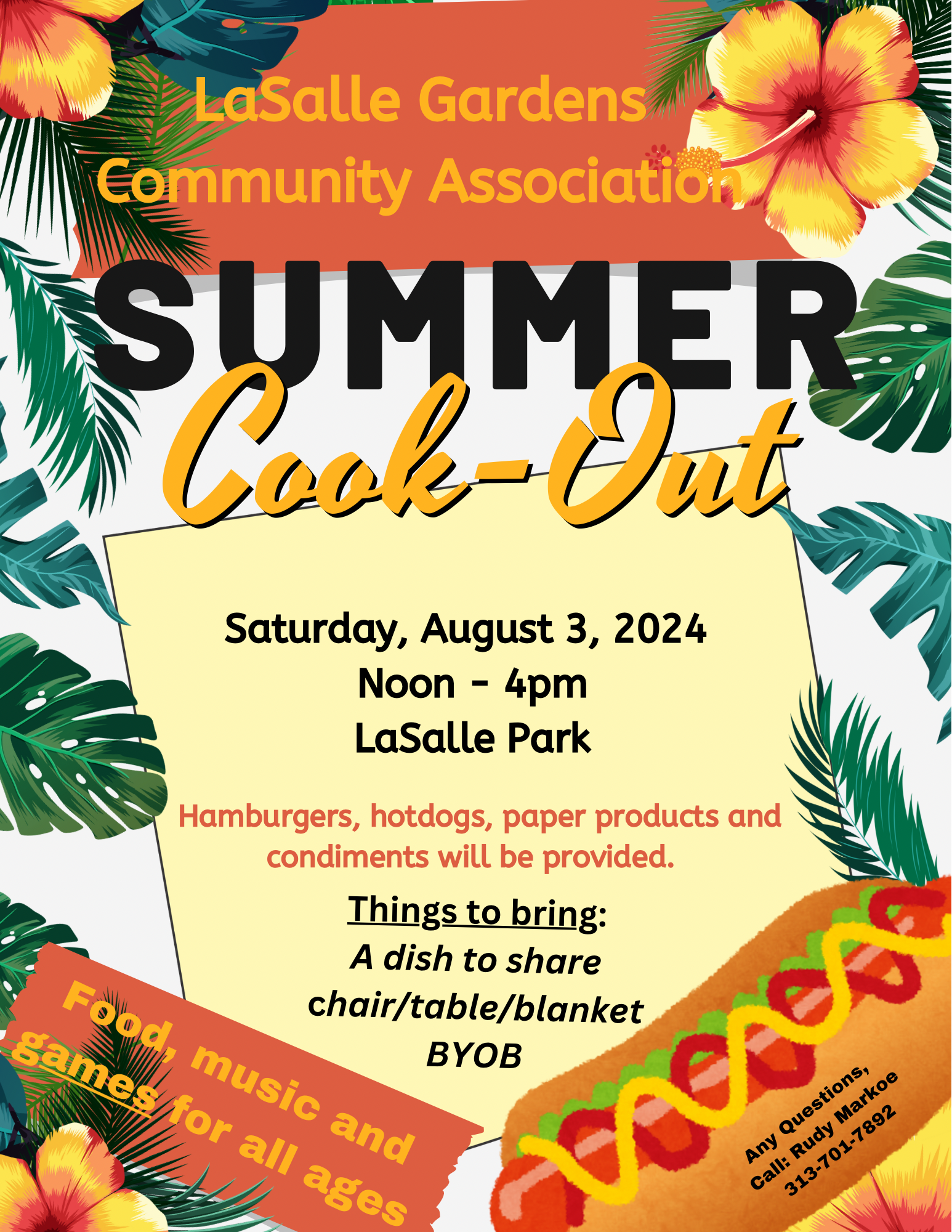 Join us for our Annual La Salle Gardens Cookout in La Salle Park from 12-4pm on August 3. We will have live music, hot dogs, hamburgers, a bounce house and other activities. Feel free to bring a dish to pass. We do need volunteers to assist. If you’d like to volunteer, please contact Esther Haugabrook 313-452-8060.